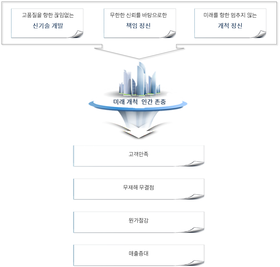 변화를 두려워하지 않는 창조적인 경영, 끊임없는 기술 혁신과 투자, 그리고 전 구성원의 화합을 바탕으로 성장하겠습니다