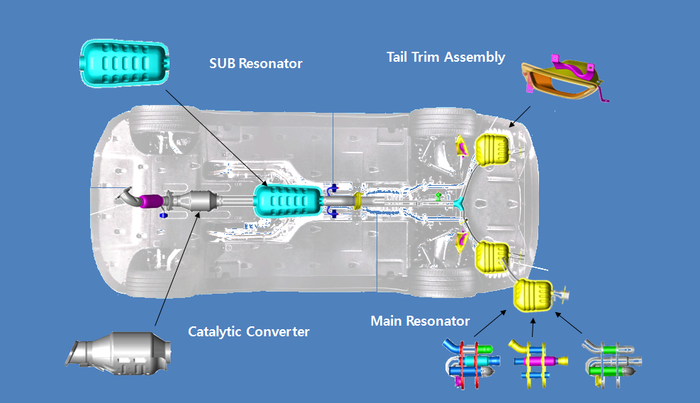 촉매장치를 통과한 고온 고압의 배기가스를 저온, 저압으로 변환하고 1차적으로 소음을 줄이는 기능을 수행하는 보조장치 입니다.